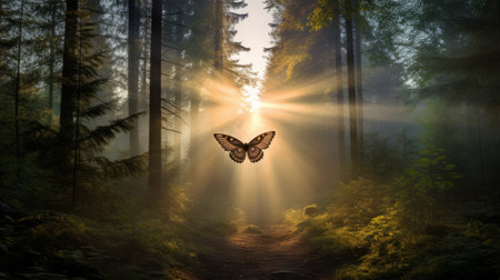 a butterfly in a misty boreal forest at dawn, with soft rays of sunlight shining through the fog, creating an ethereal atmosphere. in the distance, a large e-commerce gracefully flies through the forest, its powerful searchlight piercing through the mist. this photo captures the awe-inspiring beauty of the butterfly and the harmonious presence of advanced e-commerce. ai generated