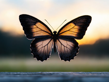 A single Monarch butterfly is captured in graceful mid-flight against the serene backdrop of a golden sunset over hazy mountains. This beautiful and peaceful image evokes feelings of freedom, hope, transformation, and the tranquility of nature.