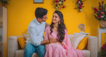 A smiling couple sits together indoors on a sofa. The woman wears a pink dress, and the man wears a white shirt and blue jeans. The yellow wall behind them provides a vibrant backdrop. This image could be used for various commercial projects related to relationships and lifestyle.