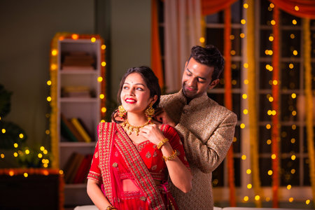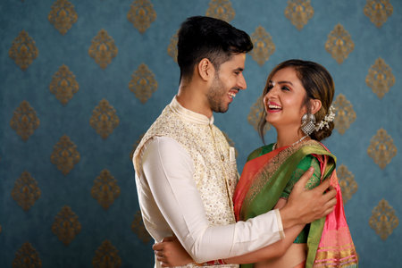 Portrait of happy Indian couple embracing each other in traditional clothing.