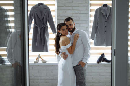 Bride and groom embrace on background of wedding costumes. Preparation for wedding. Horizontally framed shot.
