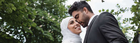 groom in suit hugging cheerful muslim bride in white hijab, banner