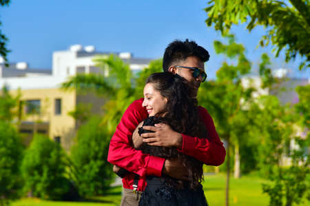 Young interracial couple hugging. Millennial lovers, african and white couple