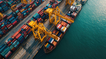An aerial view captures a cargo ship docked at a bustling container terminal, showcasing a vibrant array of shipping containers and logistics operations.