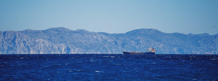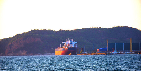 Large cargo ship sailing in the Baltic sea at sunset. Soft golden sunlight. Concept seascape. Panoramic view from the sailing boat. Freight transportation, nautical vessel, logistics