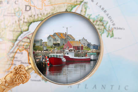Fishing boats anchored and waiting in a secluded bay in Peggy's Cove, Nova Scotia, Canada - Oct 2022. High quality photo