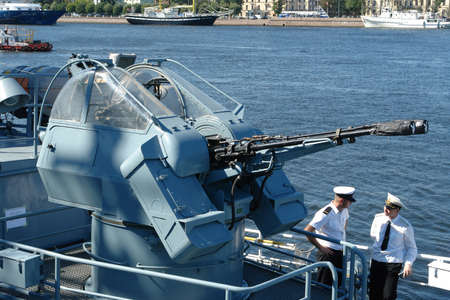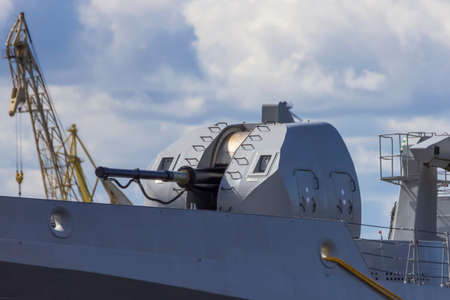 Modern naval main gun mounted on the maritime action warship use for naval warfare.