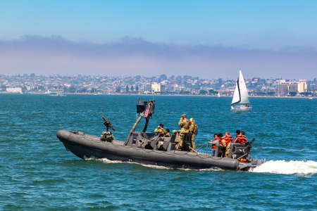 SAN DIEGO, USA - MARCH 29, 2020: Naval Base navy guard boat patrol against modern nuclear aircraft carrier in San Diego, California, USA