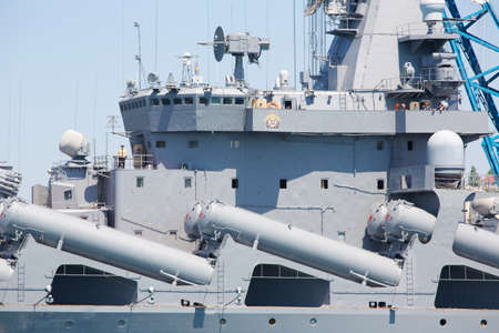 SEVASTOPOL, UKRAINE - MAY 7 . Military ship in Sevastopol harbor preparing to parade in honor of victory in world war on may 7, 2013 in Sevastopol, Ukraine
