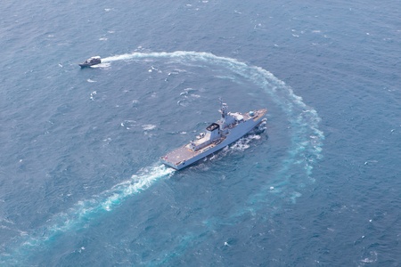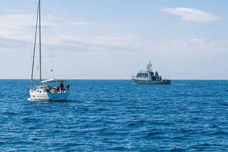 Inspection of Small Sailboat with Three People by Armed Forces Vessel on the Open Seas Today