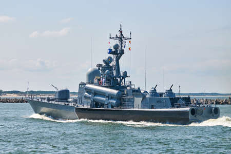 SWINOUJSCIE, WEST POMERANIAN - POLAND - 2022: A modern German corvette is going to the port