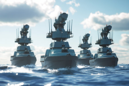 Four military vessels with missile launchers navigate tranquil seas, surrounded by a blue sky and clouds.