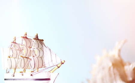 Old wooden ship with sails and masts toy on a stand. Vintage and retro toys