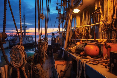 close-up of trawlers ropes and equipment at dusk, created with generative ai