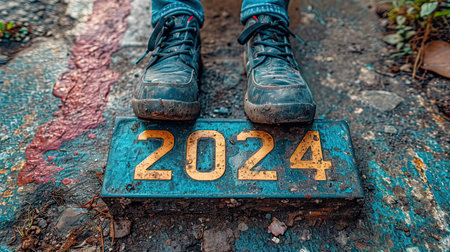 Close-up of man's feet standing on the road with the number 2024.