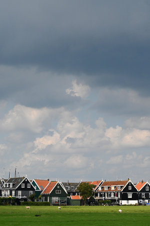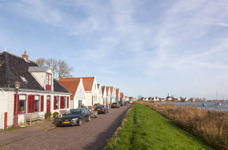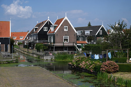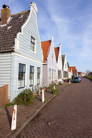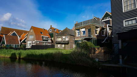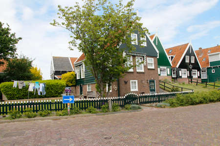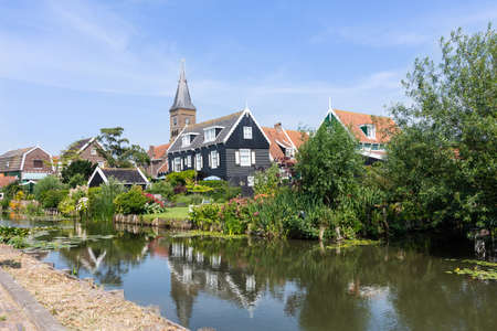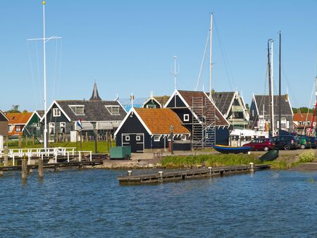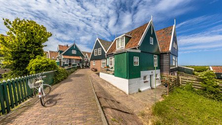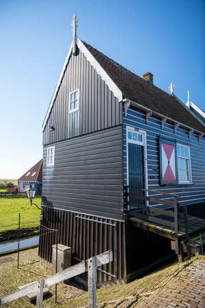 Marken, Netherlands - August 08, 2016. Picturesque traditional houses in Marken. It is known for its characteristic wooden houses and traditional costumes.