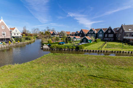 Typical Dutch village Marken with wooden green houses and small ditches, The Netherlands