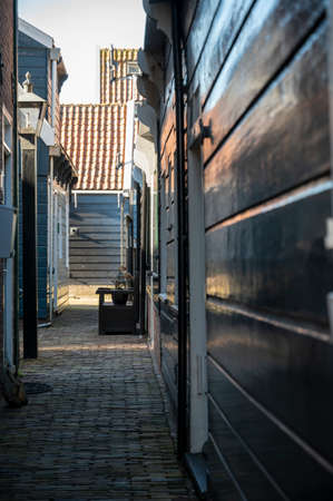 View of the Marken town center with backyards of traditional wooden houses at the Rietland street on a sunny afternoon. North Holland, The Netherlands