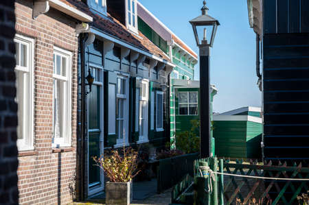 Walking on sunny spring day in small Dutch town Marken with wooden houses located on former island in North Holland, Netherlands