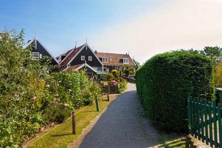 narrow street of Marken houses, Netherlands, Europe. Green gardens and blue sky on a sunny day at sunset
