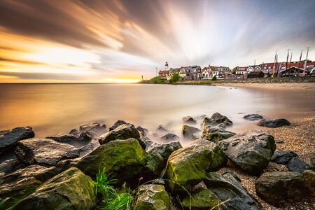 Lighthouse and village of the former Island of Urk alongside the lake IJsselmeer, long exposure with smooth water and dynamic sunset in the Netherlands