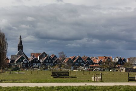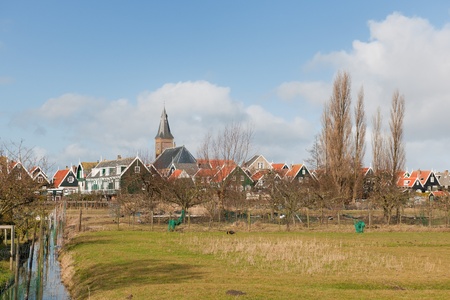 typical view of Dutch houses and church of the village Marken