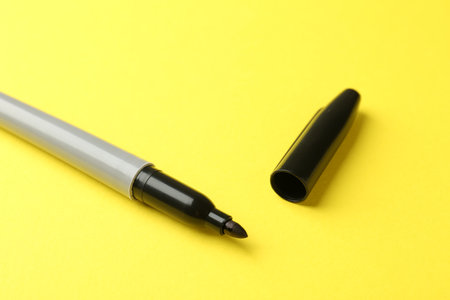 One black marker on yellow background, closeup. Space for text