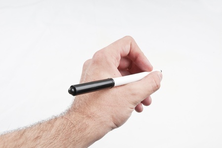 Human male hand writing something using the black pen on isolated area