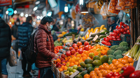 A lively urban marketplace bustling with shoppers surrounded by colorful displays of fresh vegetables and fruits, showcasing vibrant local culture.