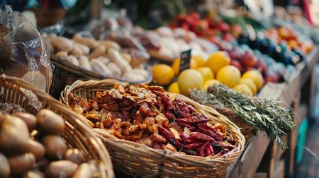 An outdoor market stall displays a variety of fresh produce. Baskets overflow with fruits and vegetables, illuminated by warm sunlight. The scene features a shallow depth of field, with soft colors and a blurred background. Suitable for illustrating themes of food, agriculture, and healthy living. The image offers versatile applications for editorial and commercial projects.