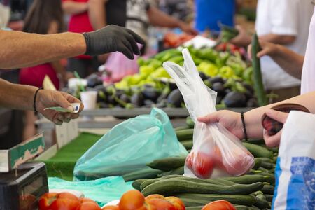 People woman man buying fresh organic fruits and vegetables at street market. Selling fruits in plastic bag, pay money.