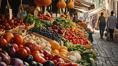 A vibrant display of fresh fruits and vegetables on a market stall is seen, with shoppers in the background. The scene features a variety of colors, textures, and natural lighting. This image could be used for advertising food products or illustrating daily life.