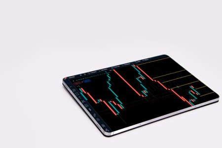 An investor is looking at a stock chart on a tablet, he is a stock investor, he trades stocks by analyzing charts and using indicators to trade. Stock investment idea.