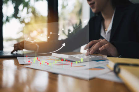The hands of a female business brokerage are planning business investments by analyzing and calculating the stock market to find market profits.
