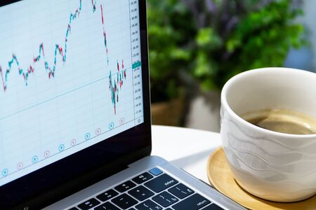 Economic crisis. Trader is sitting in home at table, working on laptop with graphics diagrams on white monitor. Cropped computer and drink coffee. Analysis Business, Statistics Concept.
