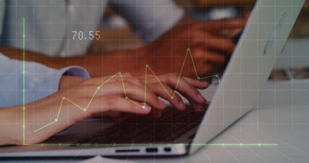 Typing on laptop, financial data graph image over hands. Business, finance, technology, analysis, digital, statistics
