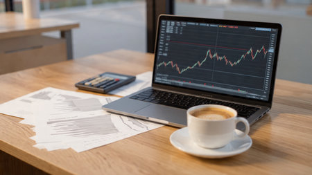 A polished wooden workspace with live trading analytics on a laptop and market reports beside a hot coffee.