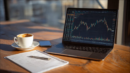 Dynamic financial charts fill the laptop screen surrounded by papers and a coffee mug on a polished wooden desk.