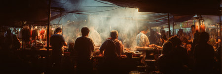 People vibrant browsing night market stalls, enjoying the warm glow of lights while purchasing fresh groceries and street food