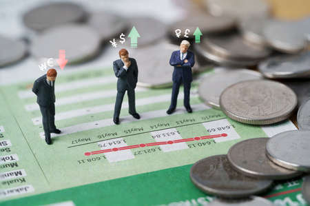 Businessmen standing on stock market graph chart with currency sign and up down arrow for forex exchange trade concept.