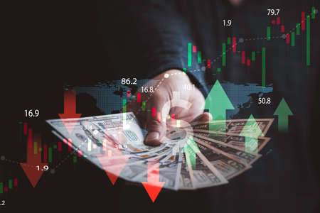 Businessman holding dollar banknote with stock market graph and up ,down arrow for currency exchange ,inflation and interest rating concept.