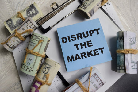 Concept of disrupt the market write on sticky notes isolated on Wooden Table.
