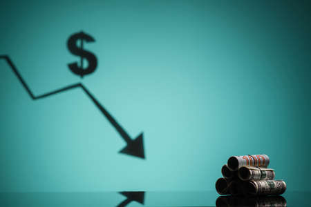 Arrow down on the background of dollar bills. The concept of inflation, depreciation of the dollar, wealth or the US economy.