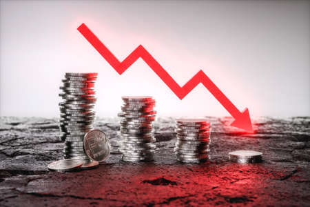 Coin stack step down graph with red arrow, Risk management business financial and investment, Copy space