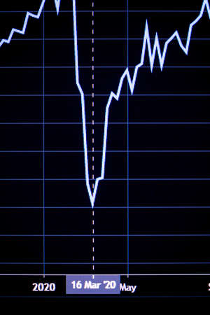 Shallow depth of field (selective focus) with details of a chart showing the stock market crash from March 2020 due to the Covid-19 pandemic on a computer screen (S&P500 index)