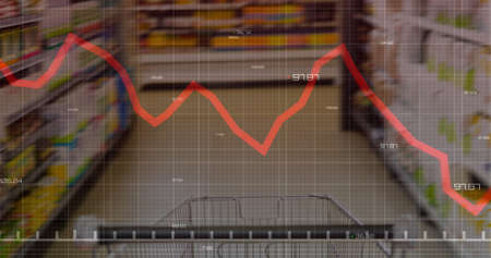 Image of data processing over trolley in shop. global business, shopping and digital interface concept digitally generated image.