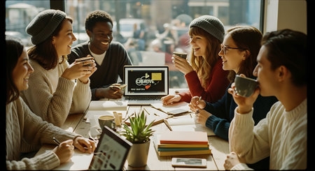 Blurred image of young professionals collaborating in an office space, surrounded by colorful sticky notes and laptops, fostering creativity and teamwork. AI generation