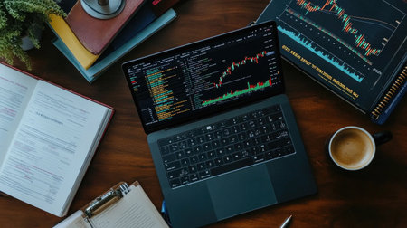 A bird's eye view of a busy desk featuring a laptop displaying stock market charts, a coffee cup, and various office supplies, creating a productive workspace.