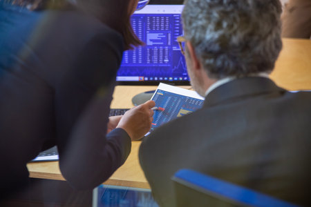 Finance professionals watching trading dynamics on monitors and document, analyzing stock market statistics. Finance or investment concept
