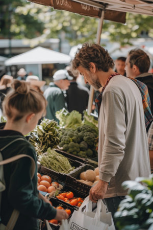 A family shopping with reusable bags and containers at a local farmers' market, choosing organic produce for sustainable living.